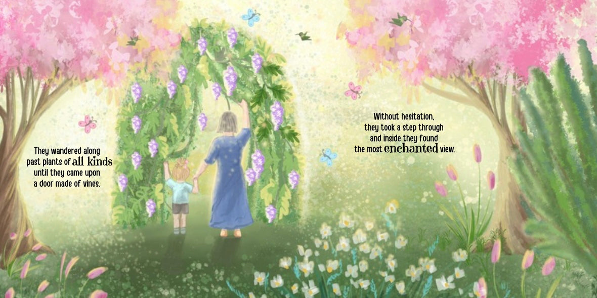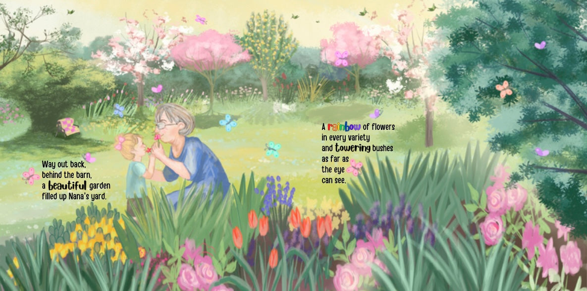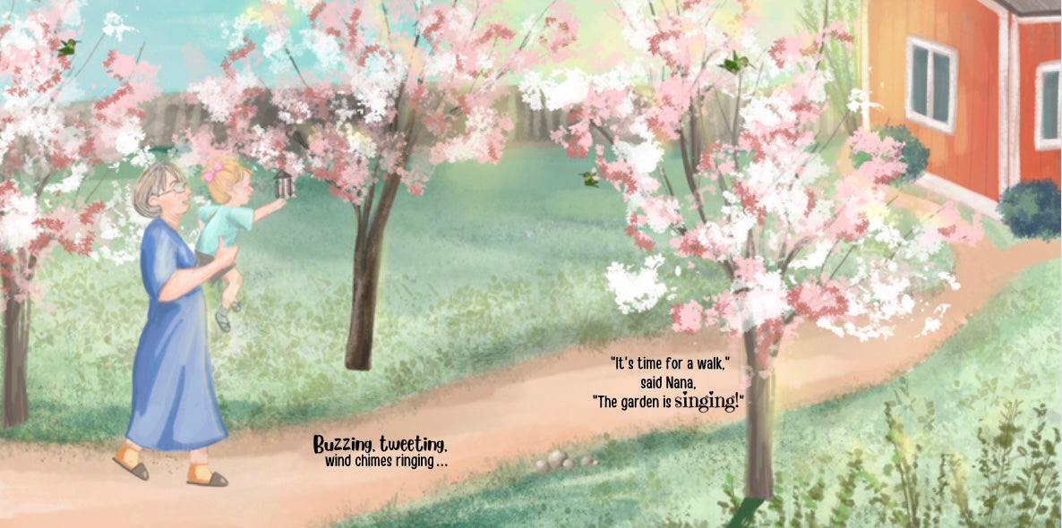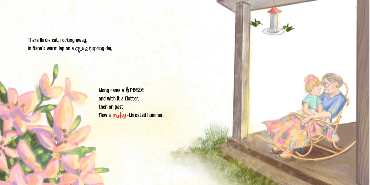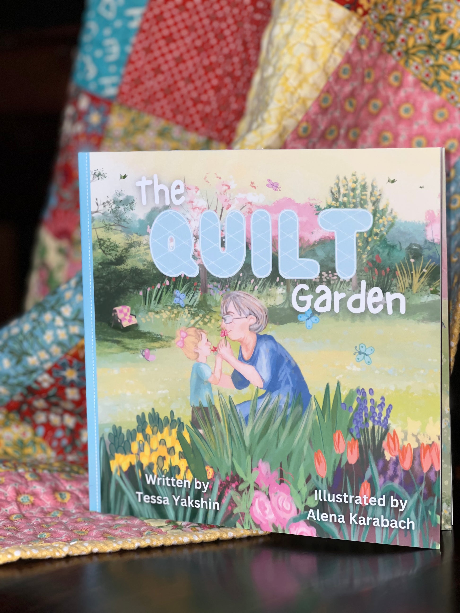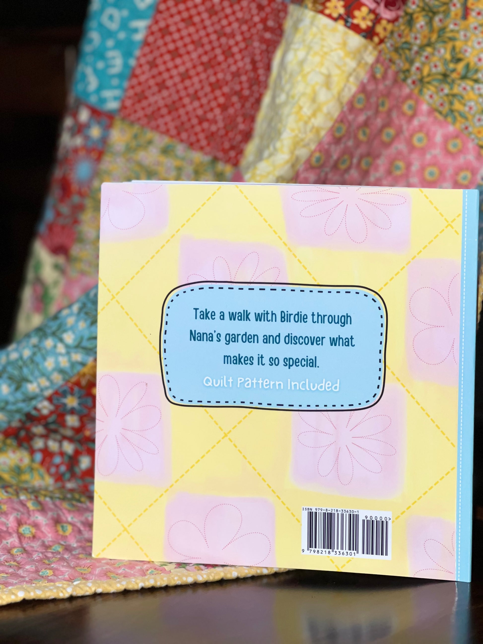 In The Quilt Garden, Nana and her granddaughter Birdie spend time together enjoying nature and going for a walk in Nana's flower garden. It feels like a magical place because it is filled with hummingbirds, butterflies, and quilts that Nana made. The book is meant to help share the beauty and magic of quilting and nature with children, toddlers, and babies.