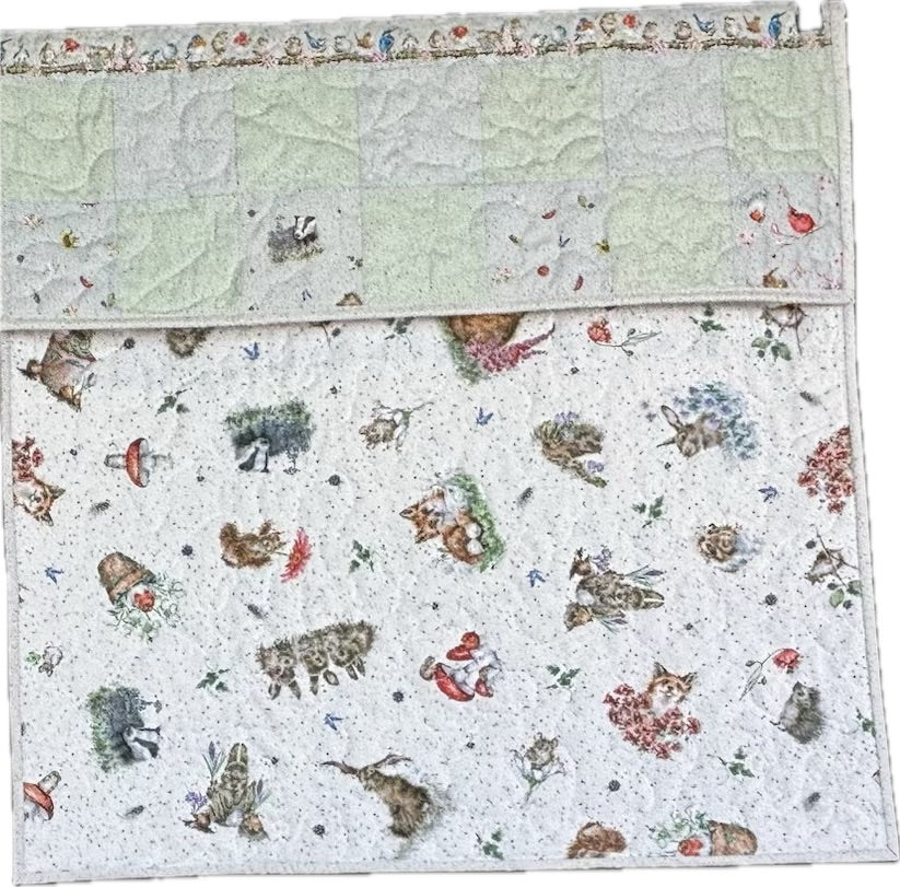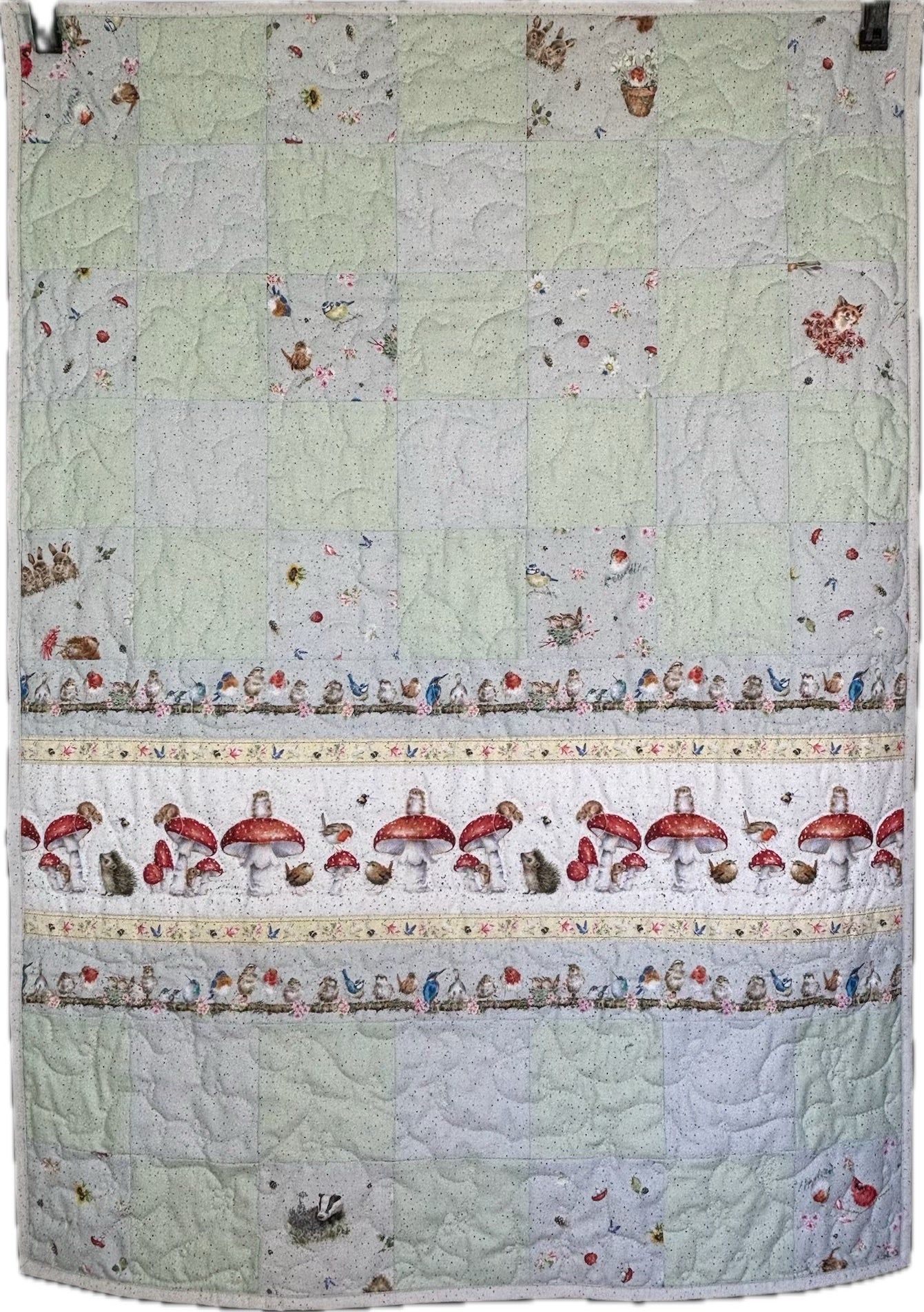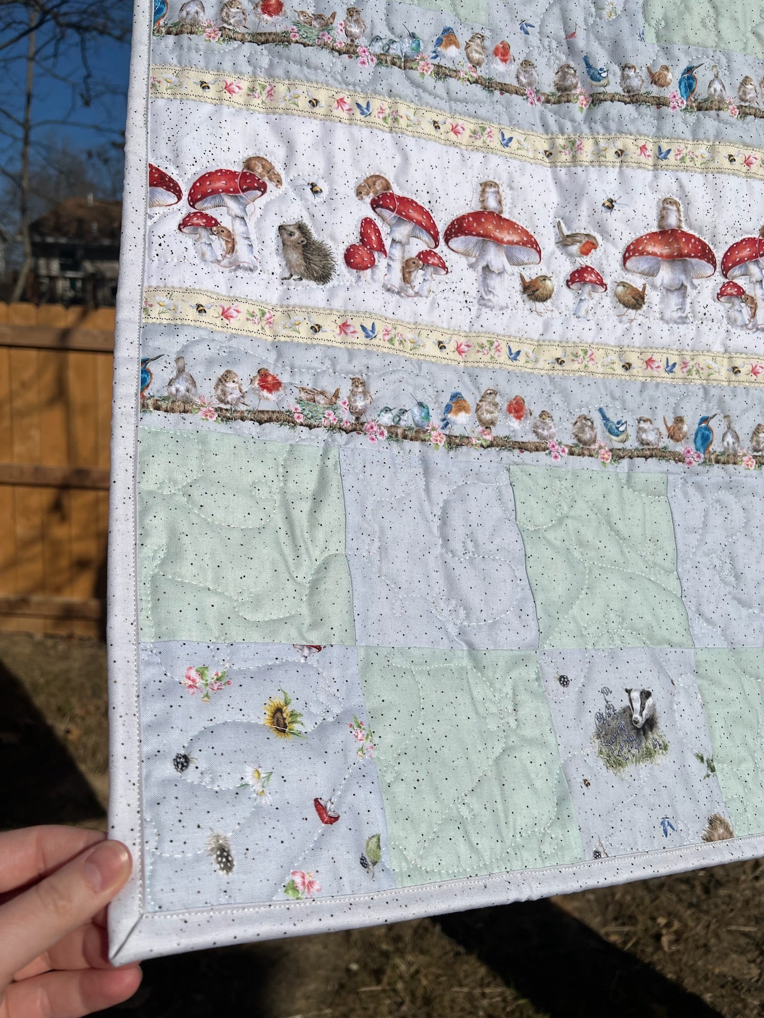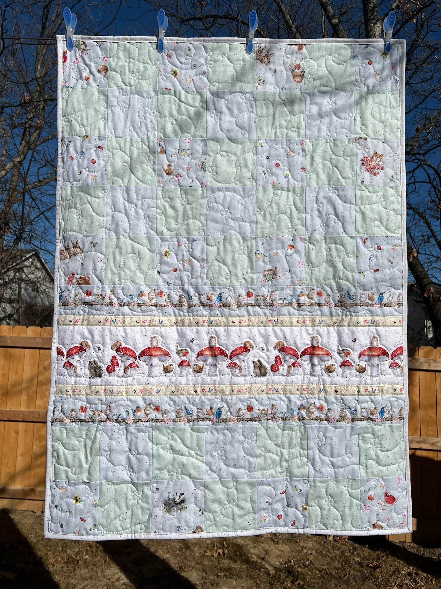 Neutral toddler/baby size quilt with little woodland animals and mushrooms. Primary colors are green and blue. The backing is minky, which is very soft.
